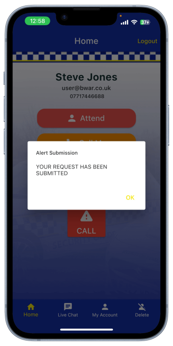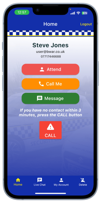 Security on Demand – This provides the same 24/7/365 access by the App as the above, however in addition you will have the option of requesting immediate Incident Response to your location, by a professional Security Company